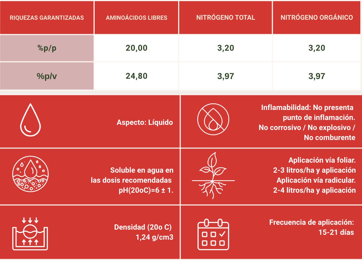 VEGEAMINO es un bioactivador a base de aminoácidos libres obtenidos mediante hidrólisis de proteínas de origen vegetal, que actúa como activador de la fisiología y de los procesos hormonales. Los elementos que contiene están destinados a estimular la función clorofílica de la planta y a acelerar el desarrollo vegetativo de los cultivos.